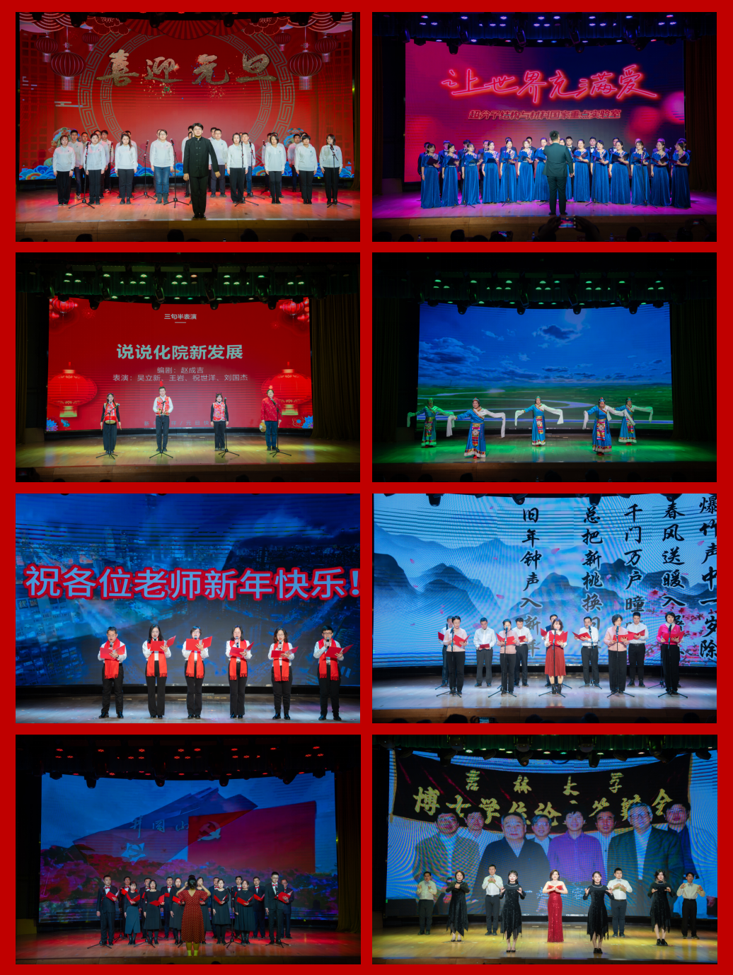 晚会节目形式多样,精彩纷呈。无机合成与制备化学国家重点实验室合唱《团结就是力量》,以激昂的歌声展现了学院师生的团结与坚定信念;特种工程塑料教育部工程研究中心、高分子科学系、有机化学系表演的三句半《说说化院新发展》,以幽默诙谐的语言和紧扣学院发展的题材赢得了现场观众的阵阵掌声;超分子结构与材料国家重点实验室合唱《让世界充满爱》,温暖人心,激发在场师生对美好未来的向往;无机化学系配乐诗朗诵《新年,你好!》,深情表达新年祝愿;分析化学系诗朗诵《教师的新年期许》,传递学院教师对吉大化学的热爱与新年的期望;特种工程塑料教育部工程研究中心表演的《一路同行》《千手观音》展现家国情怀,彰显师生才艺;化工与应用化学系合唱《没有共产党就没有新中国》,表达对党的感恩与对祖国的热爱;公共教学中心舞蹈《画你》,为大家呈现了一场视觉盛宴;学院机关合唱《化学阵线联盟》,展现学院年轻一代的青春与活力;本科生合唱《贝加尔湖畔》,旋律悠扬,令人陶醉;许文辉老师独唱《少年壮志不言愁》让人怀念青春;邹博老师独唱《小美满》,温暖人心;曹公译老师独唱《孤独娱乐》,深情演绎,触动心灵;研究生表演的舞蹈串烧将晚会推向高潮,赢得阵阵喝彩。