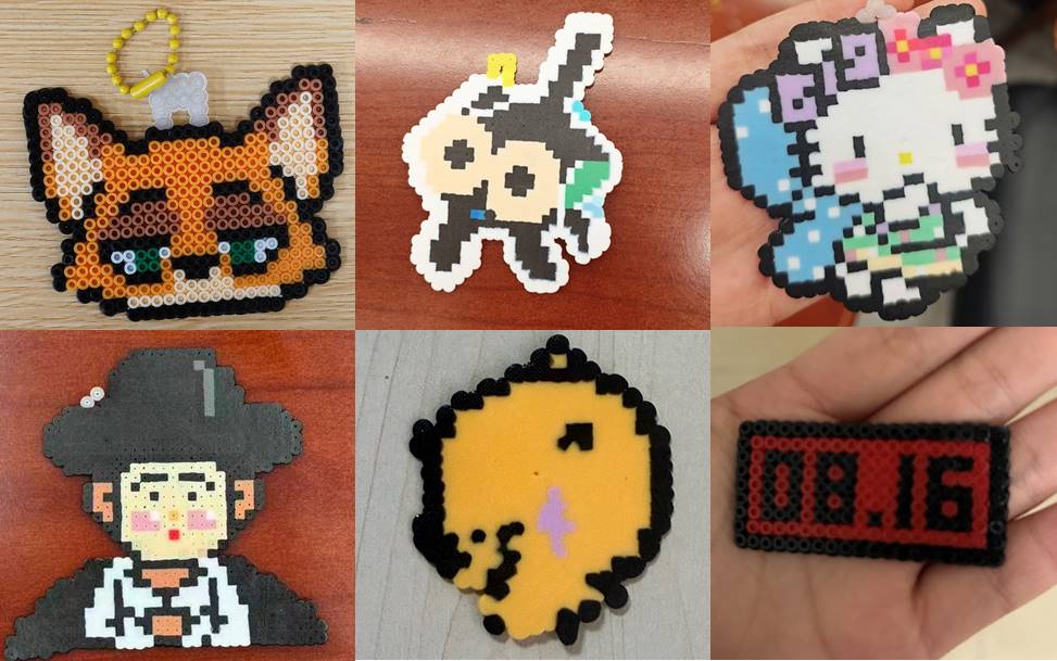 经过一个小时的精心创作,一件件创意十足的拼豆作品新鲜“出炉”:灵动的猫咪栩栩如生,卡通人物表情生动,数字徽章设计精巧。同学们手捧自己的作品相互展示并拍照留念。
