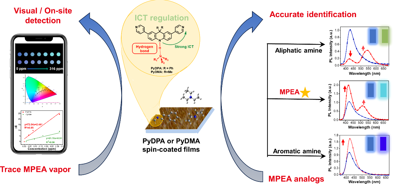针对上述问题,吉林大学的张明团队设计开发了一种非接触式荧光探针该探针通过比率型和多模式荧光响应实现了冰毒及其模拟物MPEA蒸气的快速视觉检测和准确识别。该研究在设计上受前期工作启发:二苯基吖啶为识别位点的荧光探针可以与胺形成不同强度的氢键,引起一级胺、二级胺与三级胺的差异化的响应(Adv. Funct. Mater.2023, 33, 2212980),因此有望将检测范围缩小至MPEA所属的二级胺。通过调控受体基团,该工作得到一组在聚集态下具有激基缔合物(excimer)特征发光的荧光探针。研究结果表明,这一独特的激发态特性赋予了探针多模式响应的能力,实现了基于单探针的简单、高效的传感器阵列。其中MPEA表现出不同于其他化合物的独特的双峰增强响应和青色的荧光发射。此外,该工作首次将氢键诱导的ICT调控机理引入MPEA的检测,实现了高对比度的颜色变化和裸眼可视的检测。