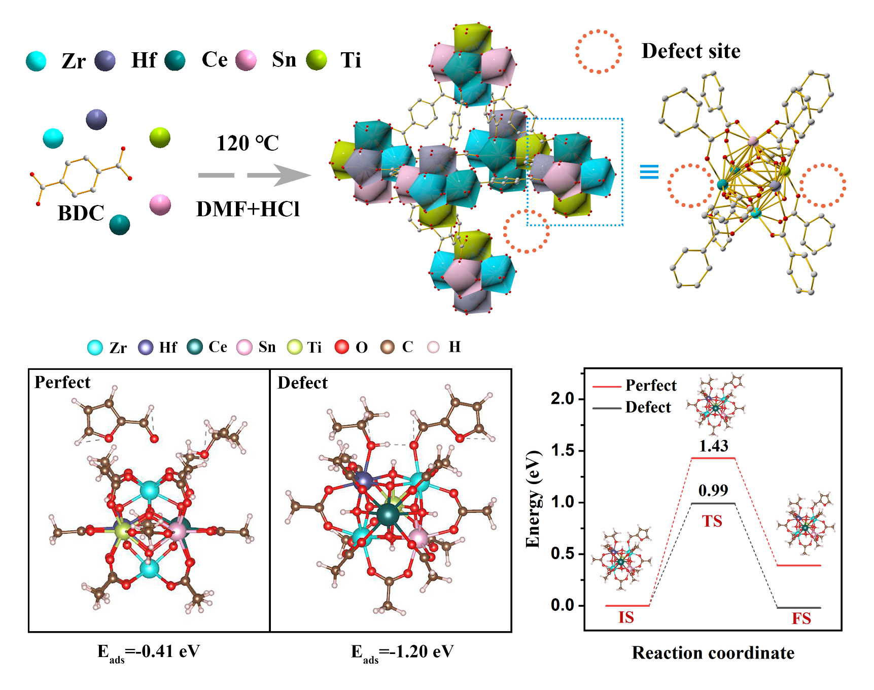 吉林大学田戈副教授课题组首次合成了高熵、缺陷丰富且粒径较小(32 nm)的UiO-66型MOF(ZrHfCeSnTi HE-UiO-66),并通过增加构型熵提高其对多种金属离子掺杂的耐受性。该高熵材料的晶格畸变导致金属节点暴露度显著增加,从而生成了配位不饱和金属位点,浓度达到322.4 μmol/g,显著提高了路易斯酸碱位点的丰富性,进而提升了其在催化转移加氢(CTH)反应中的催化性能。实验结果和理论计算都证实了配位不饱和位点的存在有效地调节了HE-UiO-66的电子结构,增强了其与底物分子的相互作用和结合,有效降低了氢转移过程的能量势垒。同位素标记质谱法证实了CTH反应路径。构象熵的增加促进了HE-UiO-66的物理化学性质(尺寸、稳定性、缺陷、配位不饱和位点和路易斯酸碱性质)的改善。该研究为构建MOFs中的配位不饱和金属位点提供了一种新策略,为MOF材料功能化的扩展提供了前景。相关研究成果发表在Nat.Comm.杂志(Nat.Commun.2025, 16, 367)。