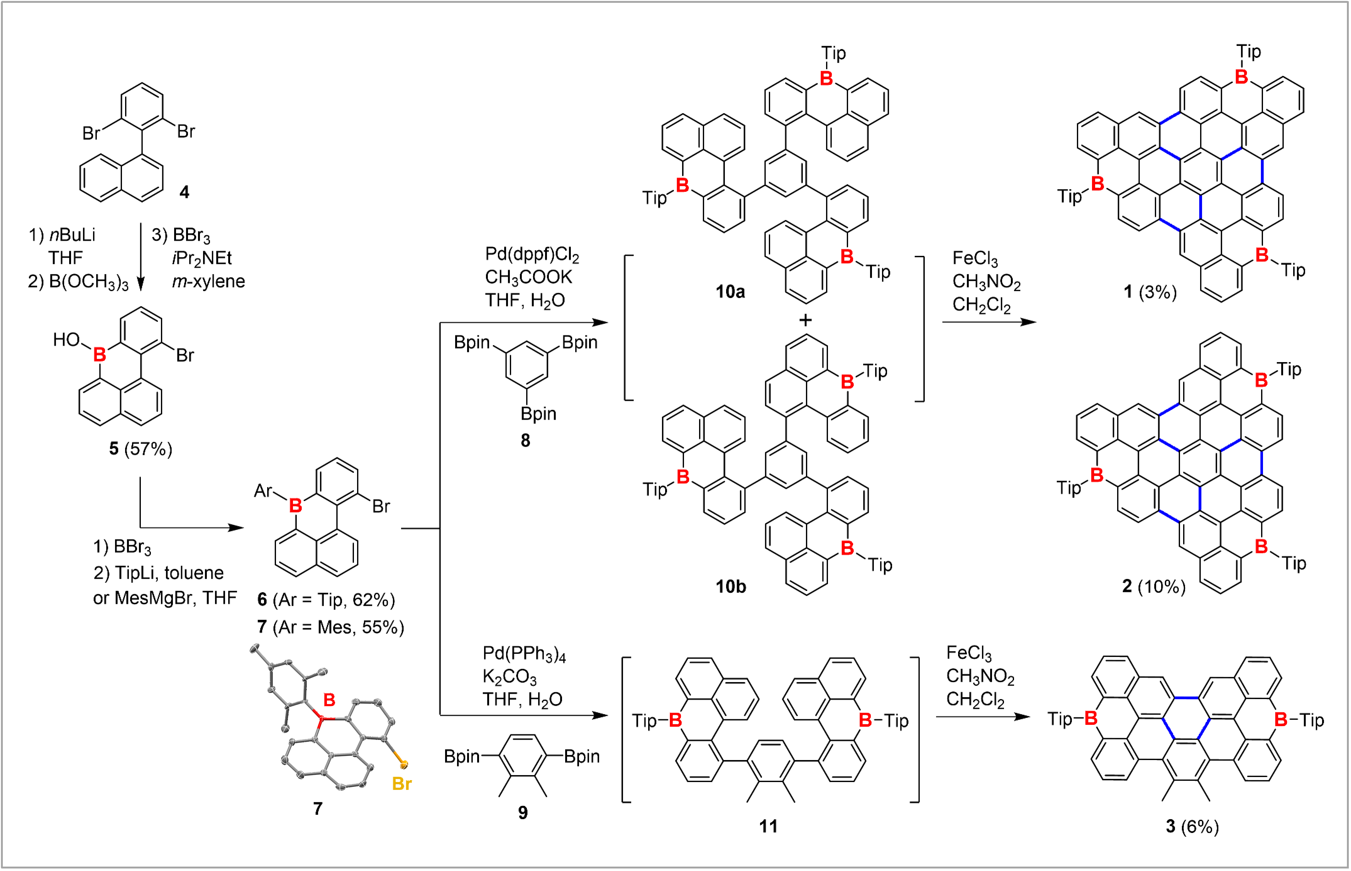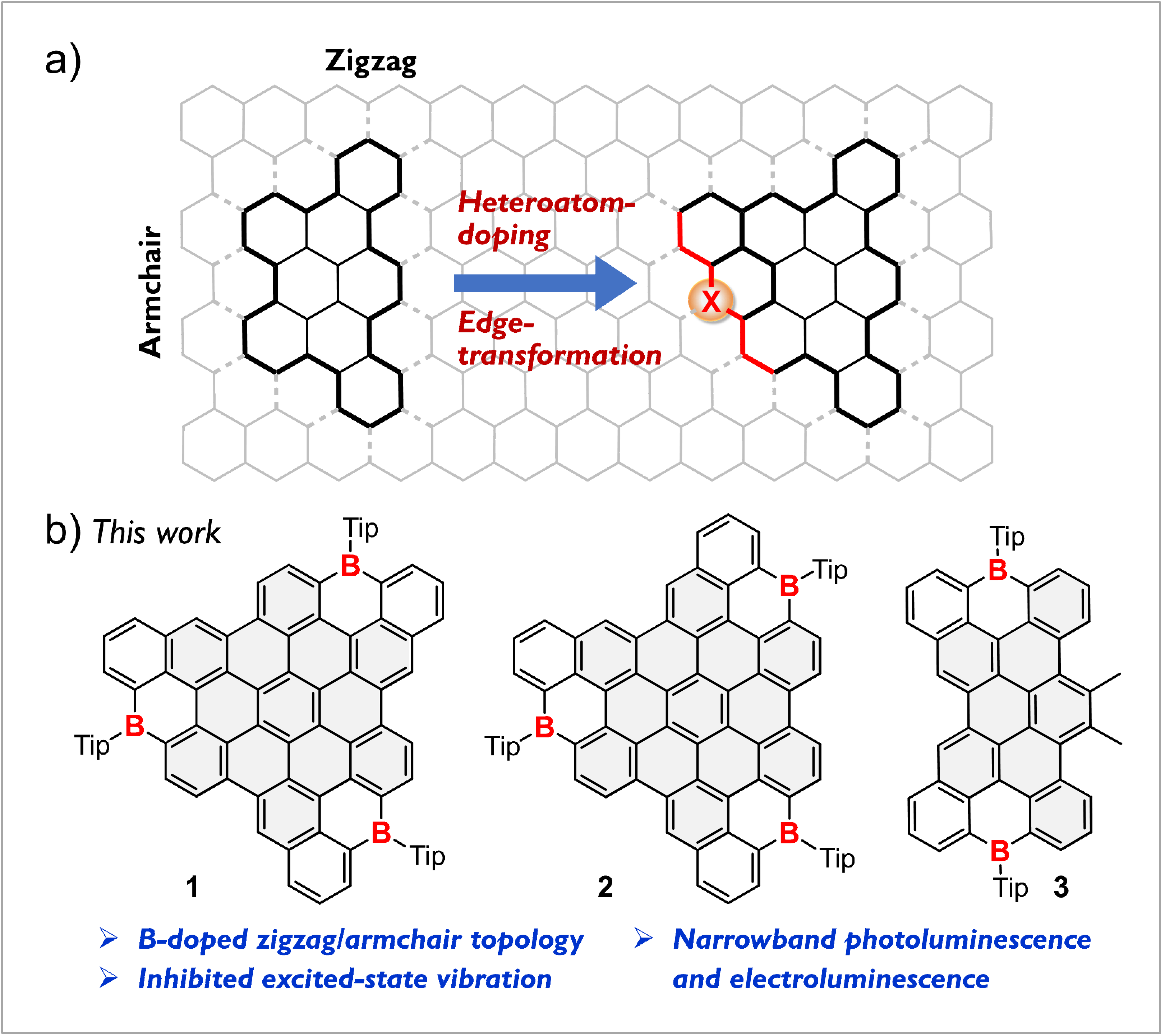分子碳,既是理解碳同素异形体结构和性质的理想框架,也是有机光学、电子学和自旋电子学等领域的重要功能体系。精准控制其拓扑结构(如尺寸、形状和边缘态)或精确引入杂原子(如氮、氧、硫等),可以有效调控能级带隙、电子跃迁、激发态辐射或非辐射跃迁等电子结构和过程,提升材料的物理化学性能。与富电子杂原子不同,硼原子具有特征的空p轨道,对分子碳进行硼掺杂,既能够形成富电子骨架和缺电子原子组成的复合共轭体系,也可以带来新性质和新功能,因而硼杂分子碳研究对于合成化学和功能材料均具有重要意义。然而,受限于硼原子对水氧敏感和稳定性偏差等问题,硼杂分子碳的可控合成仍然具有挑战性,特别是精确构筑边缘结构和/或引入多个硼原子更为困难,从而阻碍了硼化学、分子碳和有机功能材料等领域的融合发展。