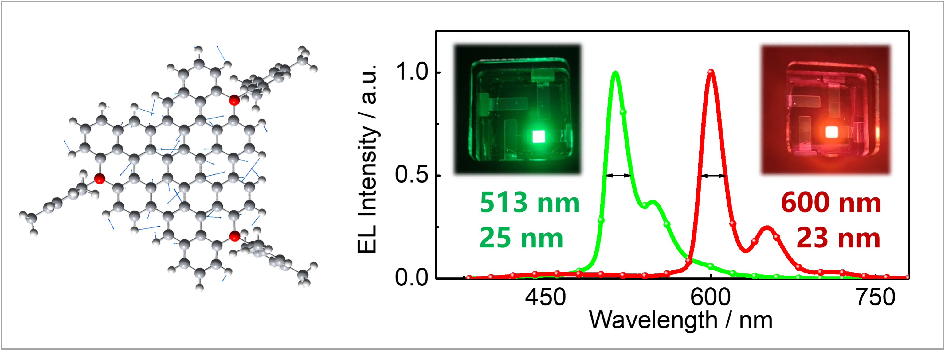 该工作的创新之处体现在三个方面:1)发展了定位硼酸化反应,合成出硼嵌苯联萘新单元,进而采用一锅多重肖尔环化反应使三个/两个硼杂单元与苯环完全稠并,构造了仅有硼杂锯齿/扶手椅边缘的分子碳13。值得注意的是,首次在有机硼烷体系发现Pd催化1,4-迁移反应,从而偶然合成出分子碳2;获得首例硼杂分子碳同分异构体12,其分别具有C3对称和不对称结构的同分异构C54B3骨架,因而实现了六苯并蔻的三重硼杂和边缘操控,亦为研究多硼掺杂和环合模式的物化效应提供了可能性。2)发现这类硼杂分子碳表现出特殊的光物理性质,即具有宽吸收光谱却窄发光光谱。相较于3的发光峰位(505nm),12的发光分别红移至556nm和589nm,并且2的发光效率(0.89)最高。更重要的是,三者的发光光谱半峰宽(FWHM)仅为12‒18 nm,如此窄谱发光在纯硼杂分子碳体系中从未报道。Frank-Condon理论研究证明,硼杂锯齿/扶手椅边缘结构协同刚性稠环骨架有效抑制了分子激发态振动,从而削弱了光谱肩带和窄化了分子荧光。3)采用溶液加工工艺组装了分子碳23的有机电致发光器件,二者电致发光峰位分别为600和513nm,半峰宽分别为23和25 nm,获得了目前电致发光的最窄红光,因而首次证明纯硼杂分子碳的窄谱电致发光性能。