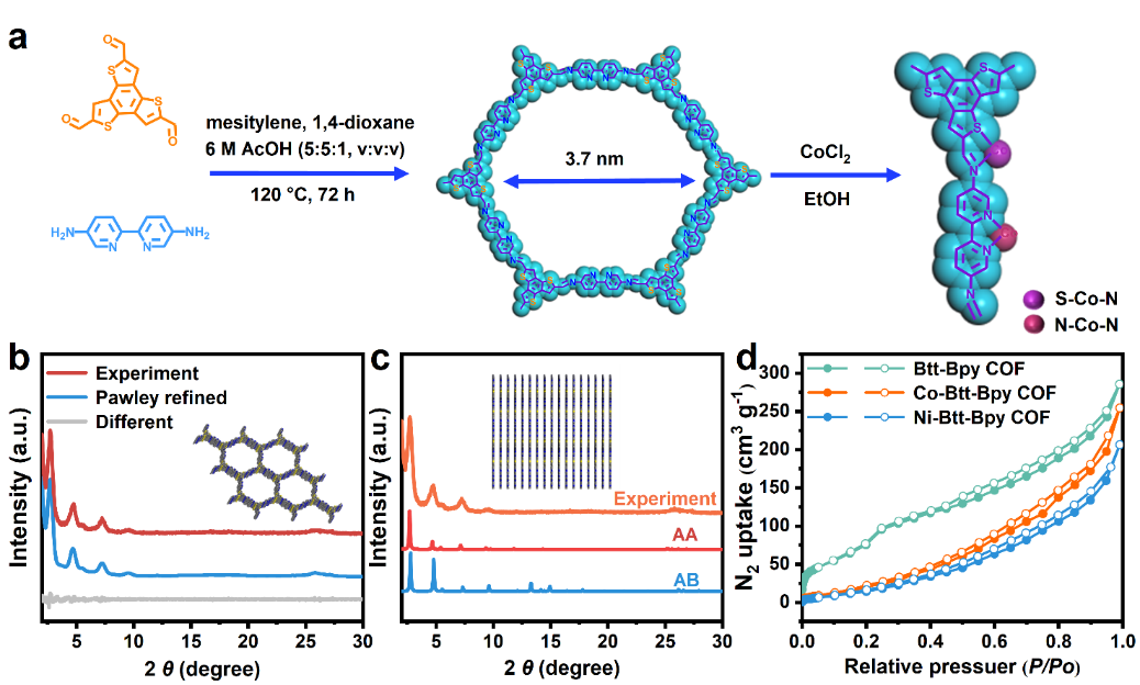 人工光合作用可以捕获CO2并将其转化为高附加值化学原料,这不仅为缓解气候变暖带来了希望,还可以将清洁的太阳能转化为可储存的化学能。但是,大多数光催化剂都只一种催化位点,只能进行CO2还原半反应或者水氧化半反应。这无疑降低了催化性能和光催化剂的整体利用率。此外,光催化剂的光生电荷和空穴严重复合等问题,也是影响光催化性能的关键因素。基于此,该团队通过引入杂原子单体构建一种具有两种Co单原子配位环境的D-A COF光催化剂。其中,N-Co-N位点作为CO2还原中心,N-Co-S位点作水氧化中心。PXRD测试表明Btt-Bpy COF结晶性良好,为AA堆叠模式(图一)。