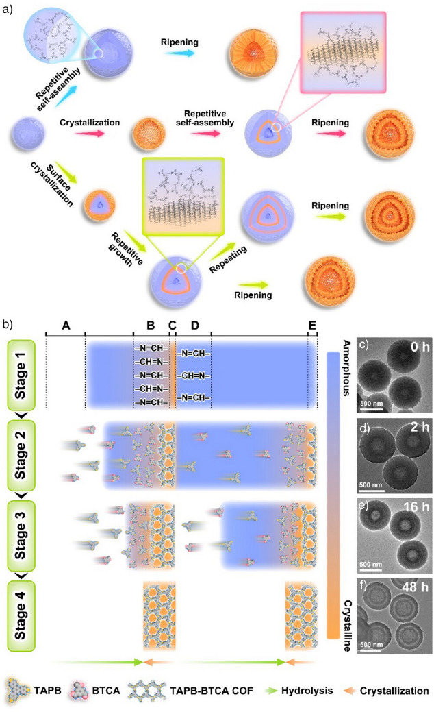 制备出的具有中空三壳结构的共价有机框架材料(3S-COF HoMSs)展现出优异的结晶度与超高比表面积(高达2137.6 m²/g),材料呈现均匀球形形貌,平均粒径约800 nm,壳层厚度约70 nm。团队成员创新性地在COP层间插入COF薄层,形成具有"结晶度波"的前驱体。在后续的动态亚胺交换反应中,由于COF层稳定性远高于COP层,且COF层两侧的COP层也因预处理而存在稳定性差异,内部COP单体优先水解迁移至低表面能区域结晶,形成稳定的多层COF结构。