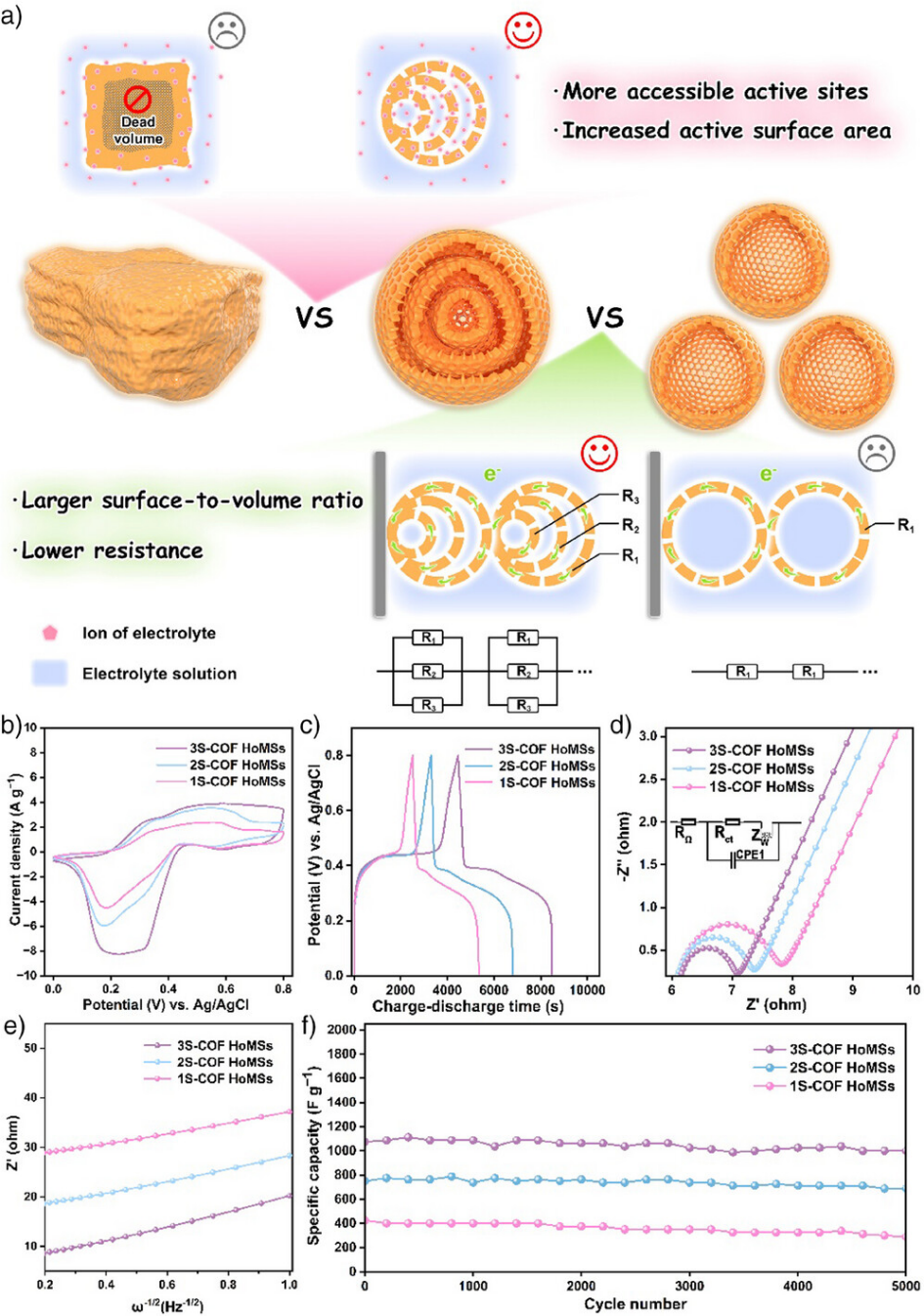 为了证明多壳空心结构的优越性,在使用1 M H2SO4+ 0.2 M KI作为电解质的三电极系统中,采用具有不同壳数的nS-COF HoMS和传统的微孔COF块体作为超级电容器电极。实验结果显示,三重壳层结构的3S-COF HoMSs材料展现出显著优势,在1A/g电流密度下,其比容量高达5025F/g,远超传统块体COF材料和单壳层、双壳层结构的比容量,该数值创下目前同类电解液体系的最高纪录。