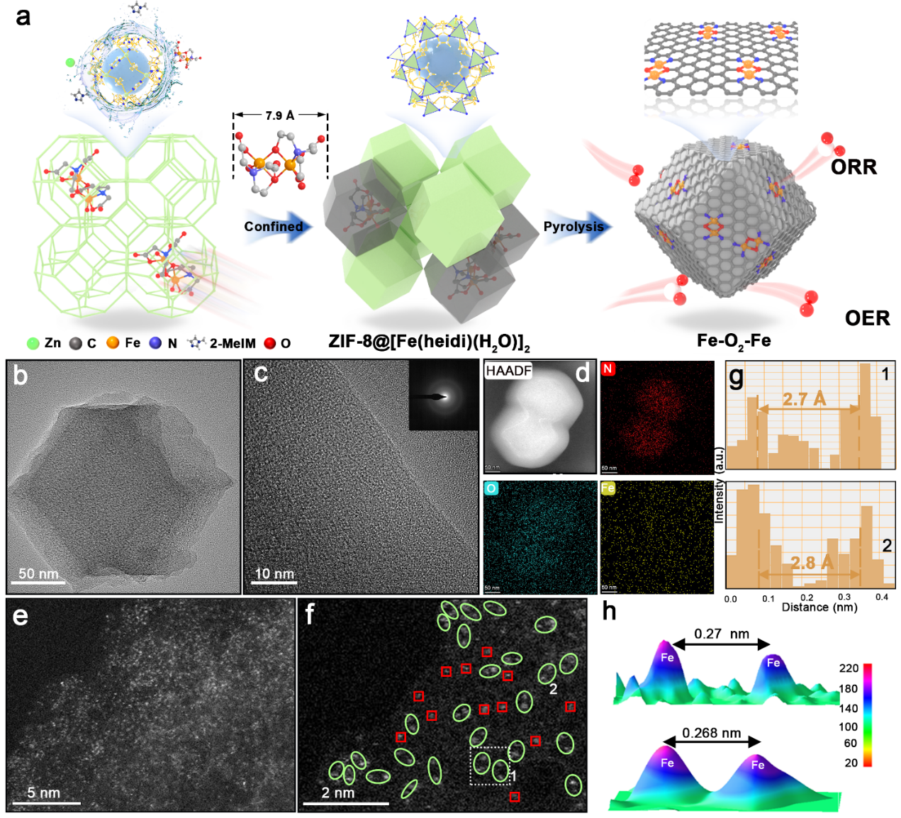 使用主客体封装策略成功构建Fe-O2-Fe。HAADF-STEM提供了铁分布状态的直接证据。图1e,f显示了Fe-Fe位点的形成,碳衬底上存在成对的Fe亮点,用绿色圆圈表示。