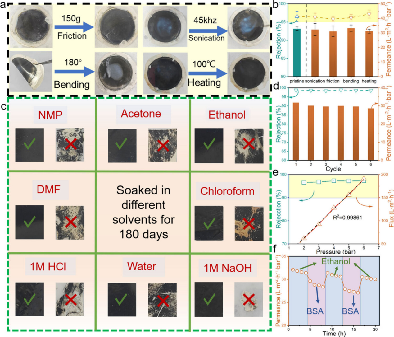 更重要的是,本研究制备的SPEEK@GO/PEEK膜具备超稳定的界面。如图3a,b所示,膜在超声,摩擦,弯折,加热的处理下仍然保持基本形态不变,性能也不受影响。在各种溶剂中浸泡180天氧化石墨烯分离层不受损(图3c)。此外在耐高压,耐污染的测试中也表现优秀(图3d,e,f)。优异的稳定性使得该膜的应用几乎不受限制,能够应对绝大多数工况。