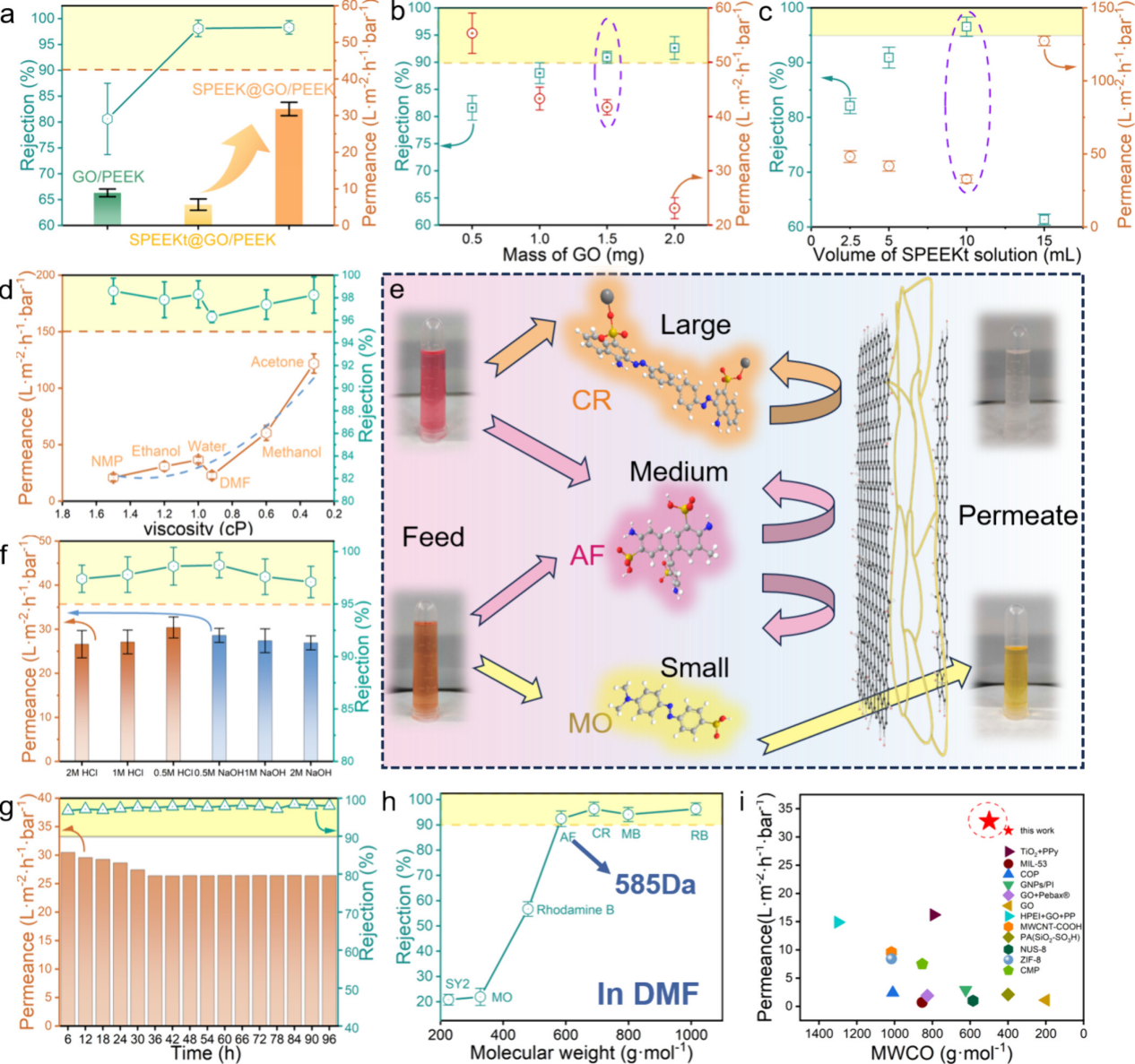 本研究首先,解决了传统结晶型聚醚醚酮难以溶液加工制备多孔膜的难题。利用苯胺取代的聚醚醚酮聚合物可溶液加工、又可转变成结晶聚醚醚酮的特点,采用NIPS法制得苯胺取代的聚醚醚酮多孔分离膜,后在分子限域空间内脱除苯胺得到结晶型聚醚醚酮基底膜。其次,解决了传统石墨烯膜层间界面稳定性差、石墨烯与高分子膜结合能力弱的问题。如图1所示,以真空辅助的方式将氧化石墨烯纳米片抽滤到聚醚醚酮基底膜上得到石墨烯纳米分离层后将磺化聚醚醚酮稀溶液抽滤浸透整张膜片(图1a),诱导SPEEK脱除苯胺后结晶,形成稳定的耐溶剂复合膜。通过高分辨透射电子显微镜技术(HRTEM)和纳米红外(Nano IR)对膜的结构进行分析,证明了GO片的层状结构和结晶SPEEK对多重界面的锚定作用(图1e,h)。