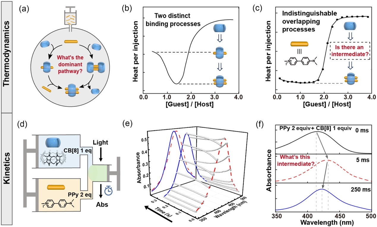 图1.(a)葫芦[8]脲与客体分子形成2:1复合物的可能组装路径;(b–c)热量滴定揭示典型体系的两步结合行为及单步重叠过程;(d–f)停流吸收光谱实验证实组装过程中存在短寿命红移中间体。