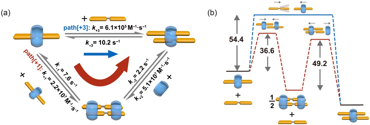 图2.(a)复合过程的动力学网络示意,显示两条竞争路径:经由2:2中间体的path[+1]的速率常数为直接结合客体的path[+3]的36倍;(b)两条路径的能量势垒对比图(单位:kJ/mol)。