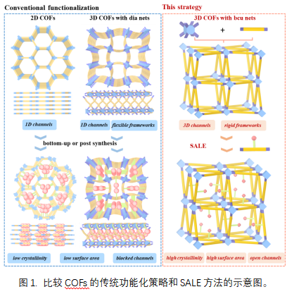 图1. 比较COFs的传统功能化策略和SALE方法的示意图。