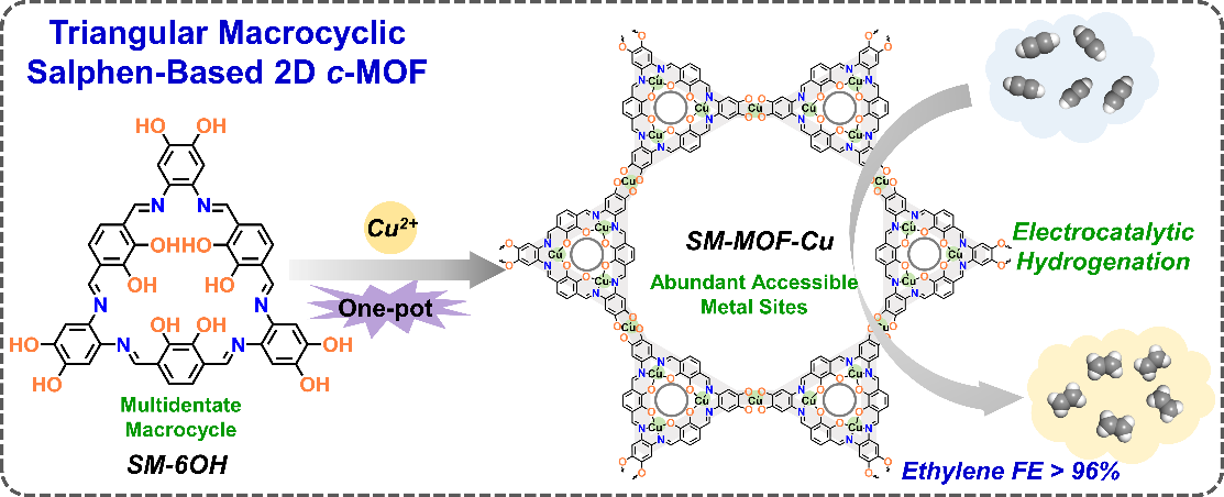 2025年9月13日,团队在Angew. Chem. Int. Ed.发表题为“Multidentate Macrocyclic Salphen-Based 2D Conjugated Metal–Organic Framework”的研究论文。研究团队设计合成了一种基于Salphen大环的2D c-MOF(SM-MOF-Cu),其内部具有多齿配位位点。通过系统的结构表征证实了材料的高结晶度与ABC堆叠模式。与传统单金属位点的酞菁基MOF对比证明,Salphen大环带来的高密度铜活性位是实现优异催化性能的关键。该工作丰富了基于大环的2D c-MOFs体系。西北工业大学张健教授和吉林大学陈龙教授为共同通讯作者。