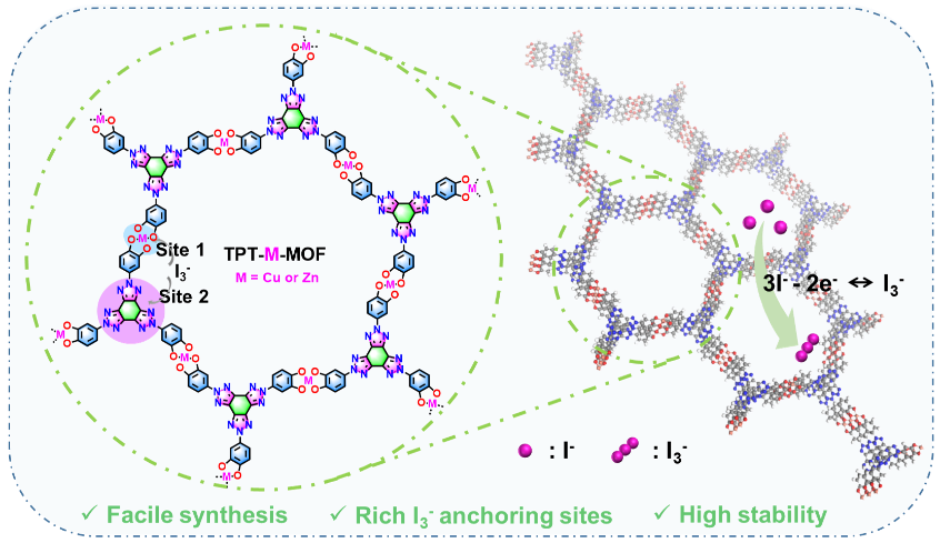 2026年3月2日,团队在Angew. Chem. Int. Ed.发表题为“N-Rich Tris(triazole)-Based 2D Conjugated Metal-Organic Framework for High Performance Aqueous Dual-Ion Batteries”的研究论文。该工作设计合成了两种新型三(N-苯基)三唑基二维共轭金属有机框架(TPT-M-MOF, M = Cu, Zn),并将其作为碘物种的载体材料用于水系锌-碘双离子电池。研究发现,富氮骨架与[MO₄]金属中心对I3⁻物种的协同锚定作用是提升电池性能的关键。其中,TPT-Zn-MOF在1 A g-1电流密度下实现435 mAh g-1的高比容量,并在5 A g-1下循环1000圈后仍保持良好稳定性。光谱表征与理论计算表明,优异的电池性能源于富氮骨架的丰富作用位点与配位金属中心的协同效应。该工作为开发高性能水系双离子电池碘载体材料提供了新思路。吉林大学博士研究生刘乐和东北师范大学博士研究生于杰为共同第一作者,湖南科技大学陈建教授、东北师范大学王恒国教授和吉林大学陈龙教授为共同通讯作者。