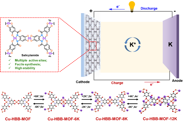 2025年5月16日,团队在J. Am. Chem. Soc.发表题为“In Situ Construction of Amide-Functionalized 2D Conjugated Metal–Organic Frameworks with Multiple Active Sites for High-Performance Potassium-Ion Batteries”的研究论文。该工作通过原位金属配位诱导平面化策略,成功制备了层状二维Cu-HBB-MOF。得益于其丰富的氧化还原活性位点与大比表面积,该材料作为钾离子电池正极表现出卓越性能,在0.2 A g-1电流密度下获得228.1 mAh g-1的初始容量,在5.0 A g-1下循环2500次后仍保持103.6 mAh g-1,每循环容量衰减率仅0.011%。结合光谱技术与DFT计算,团队揭示了动态氧化还原机制与构效关系。该研究为设计具有多活性位点的2D c-MOFs提供了有益参考。东北师范大学王恒国教授和吉林大学陈龙教授为共同通讯作者。