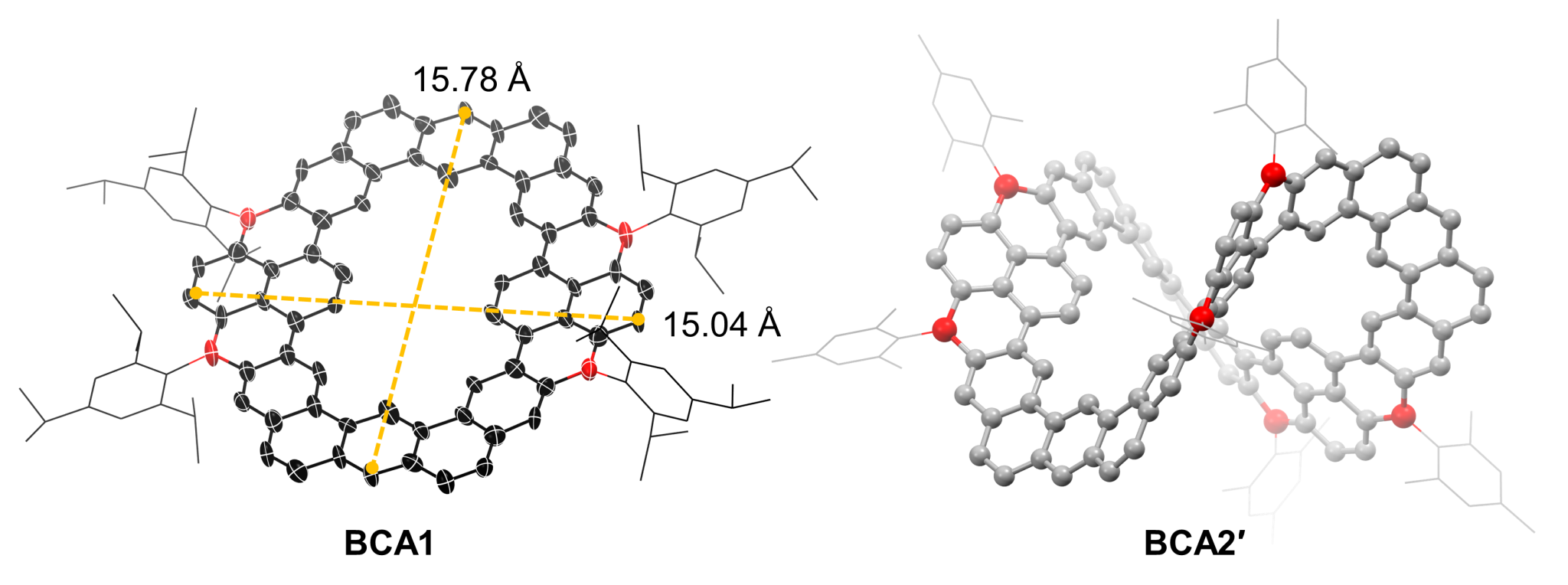 鉴于此,吉林大学窦传冬教授课题组提出并实现了分子环带的硼原子掺杂(图1),通过设计新型硼烷单元、优化大环合成策略,构造出两例纯硼掺杂的分子环带(BCA1和BCA2),进而揭示了硼原子赋予分子环带的独特物化性质,包括低LUMO能级结构、宽光谱吸收和红色荧光性质、以及长程独立还原反应过程和二价阴离子的强开壳双自由基特征。这类分子代表了首例硼杂环带分子碳,成为含硼分子碳家族的新类型成员(Angew. Chem. Int. Ed. 2026, DOI: 10.1002/anie.8330393,VIPpaper)。
